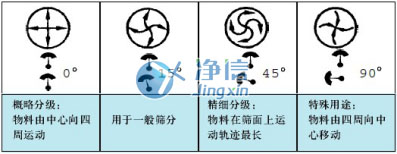 三次元旋振篩,由直立式電機作激振源,電機上端安裝偏心重錘(基準塊),下端安裝可調節偏心塊,如下圖所示,當兩側偏心塊向中間合攏,振幅變??;當偏心塊向兩側分離,振幅變大。通過調節偏心塊的位置將電機的旋轉運動轉變為水平、垂直、傾斜的三次元運動,通過調整下端兩偏心塊的夾角大小來控制振幅,把這個運動傳遞給篩面調節下端偏心塊的相位角,可以改變物料在篩面上的運動軌跡。